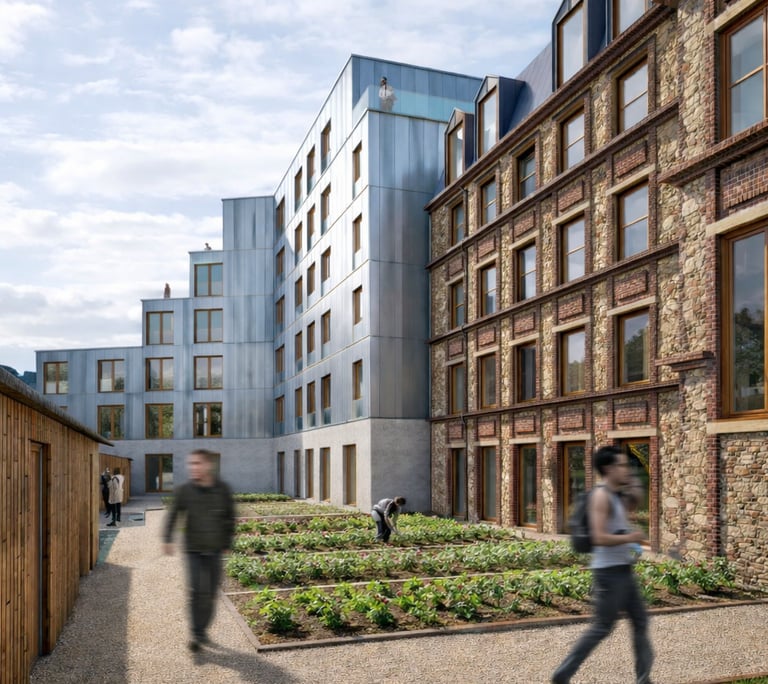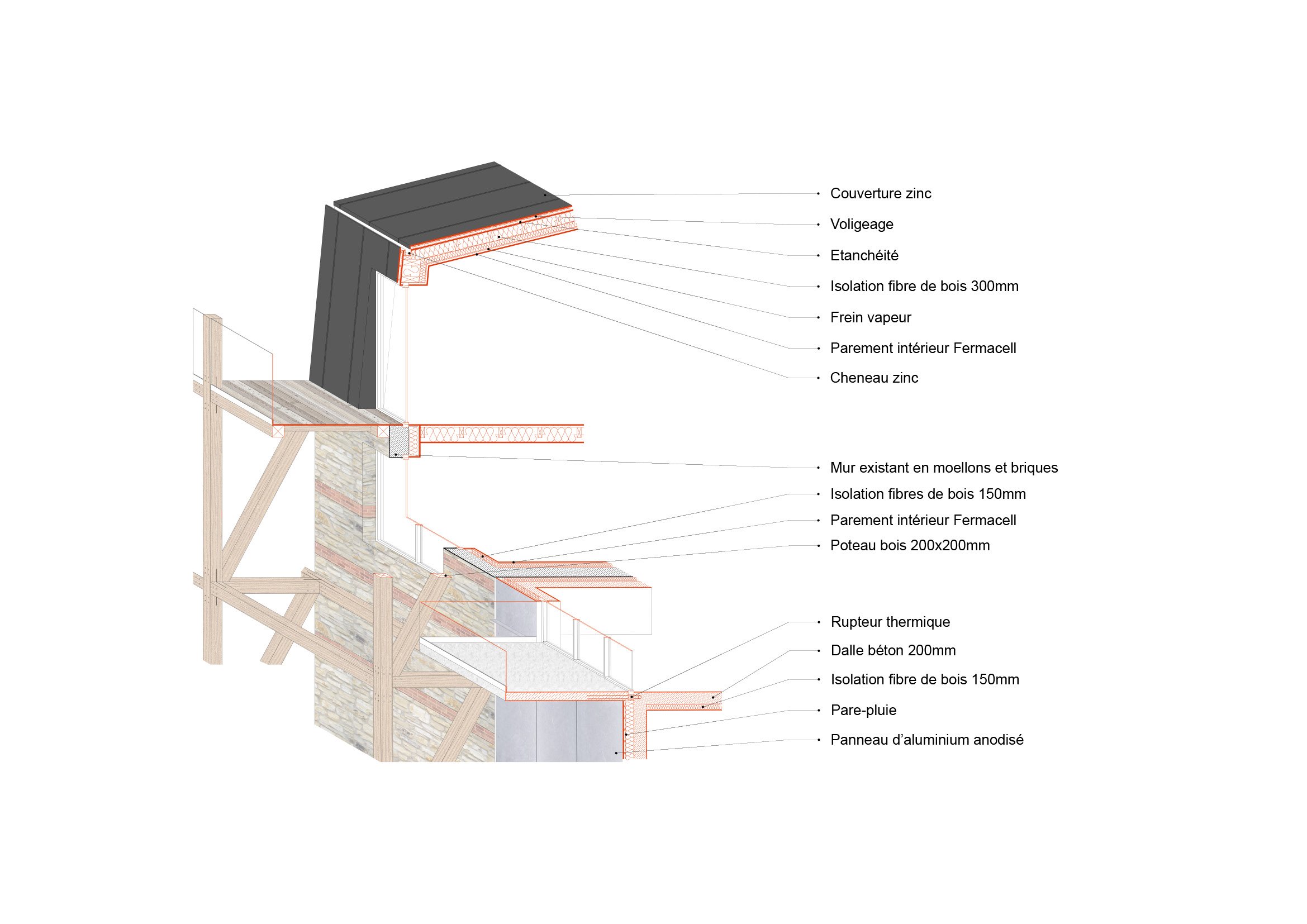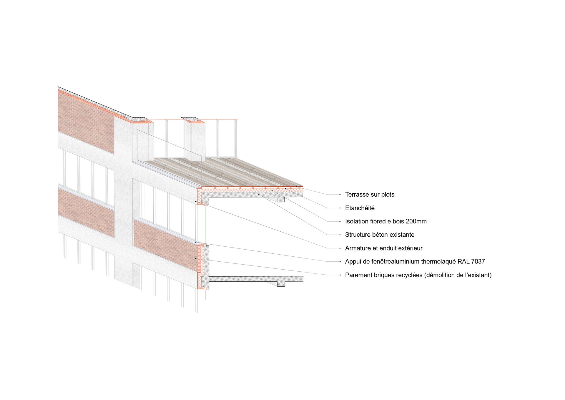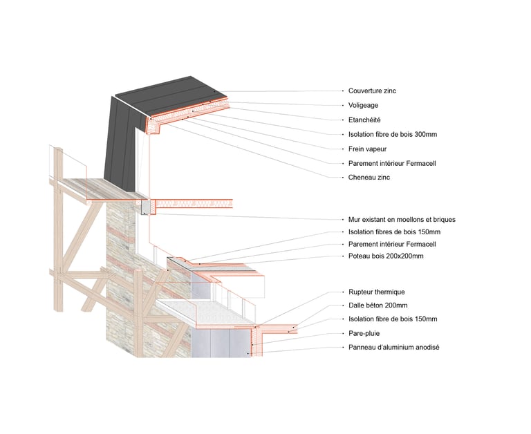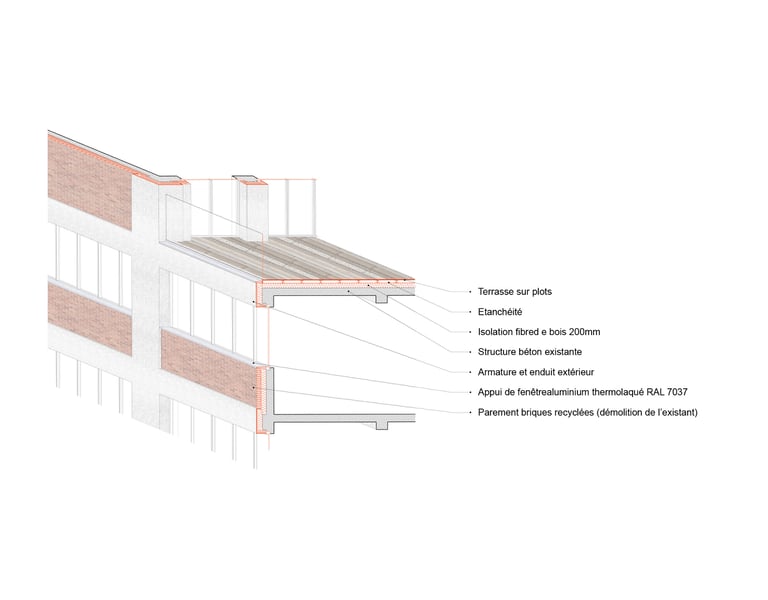 Matériaux : Béton bas carbone (planchers, façades), Bois (planchers, charpente, structure des balcons, isolation laine de bois), briques (façade), aluminium (bardage, menuiseries)