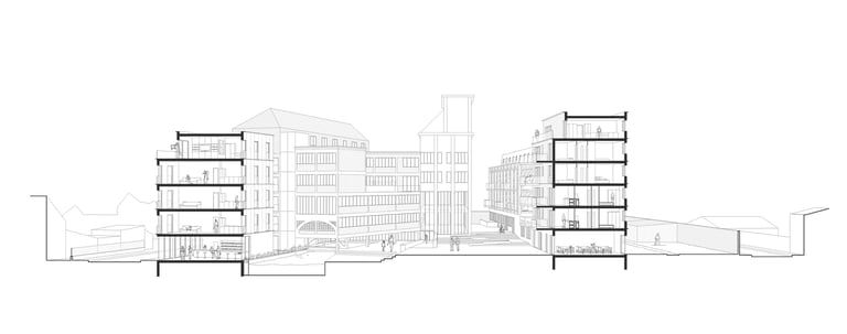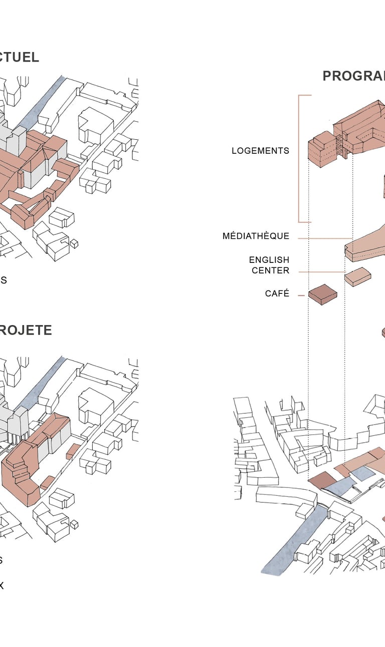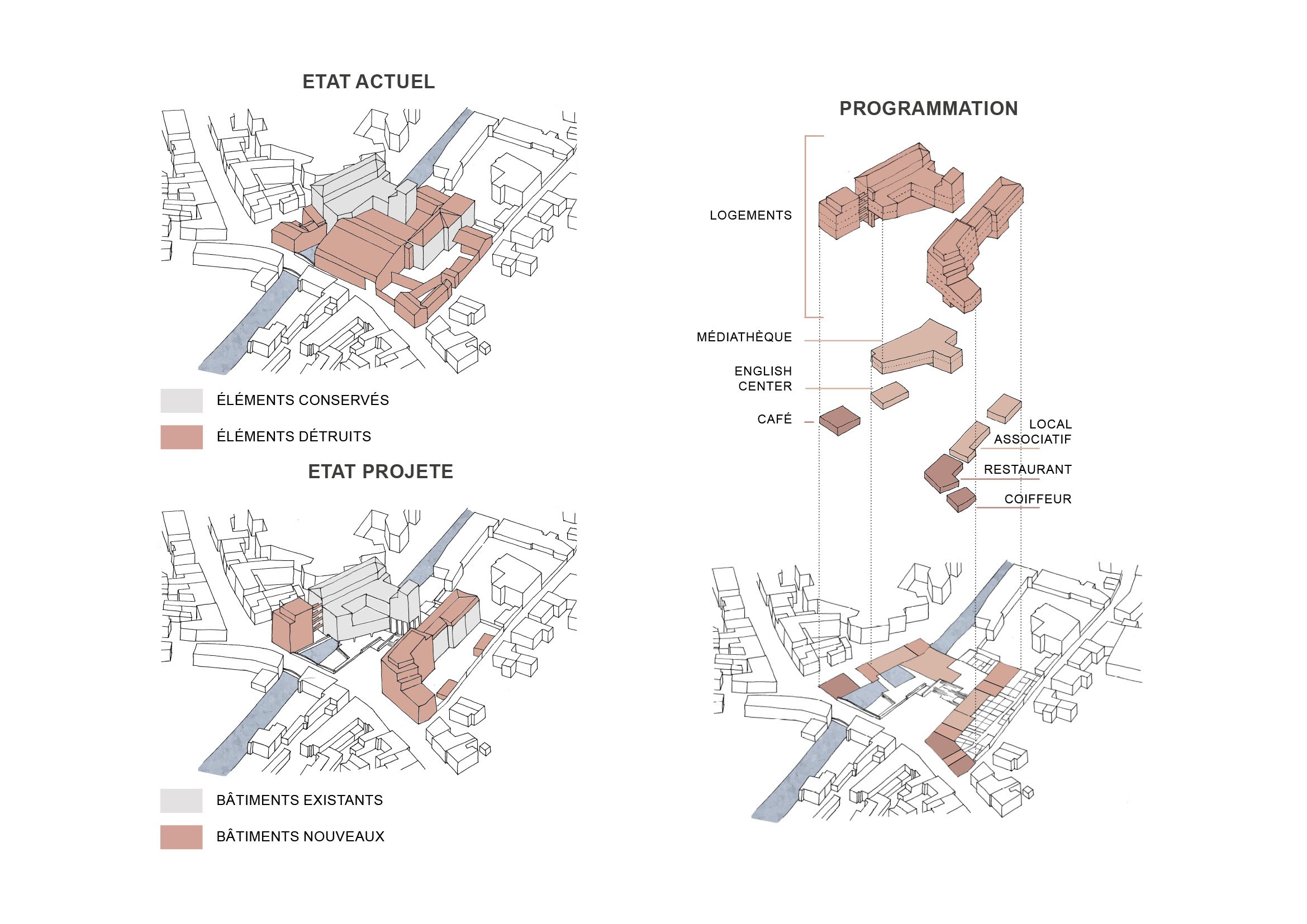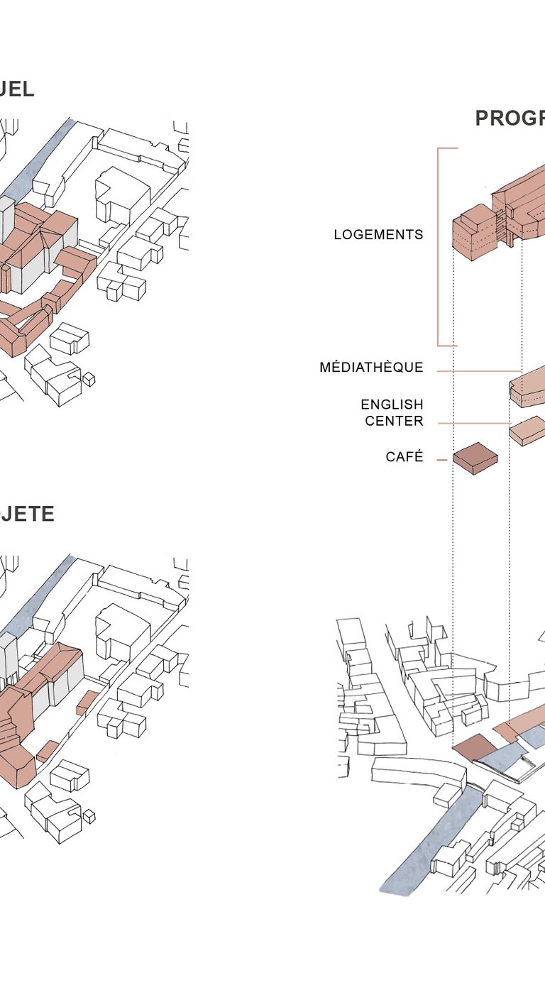 Programme : 27 logements collectifs réhabilités, 18 logements neufs, commerces, médiathèque