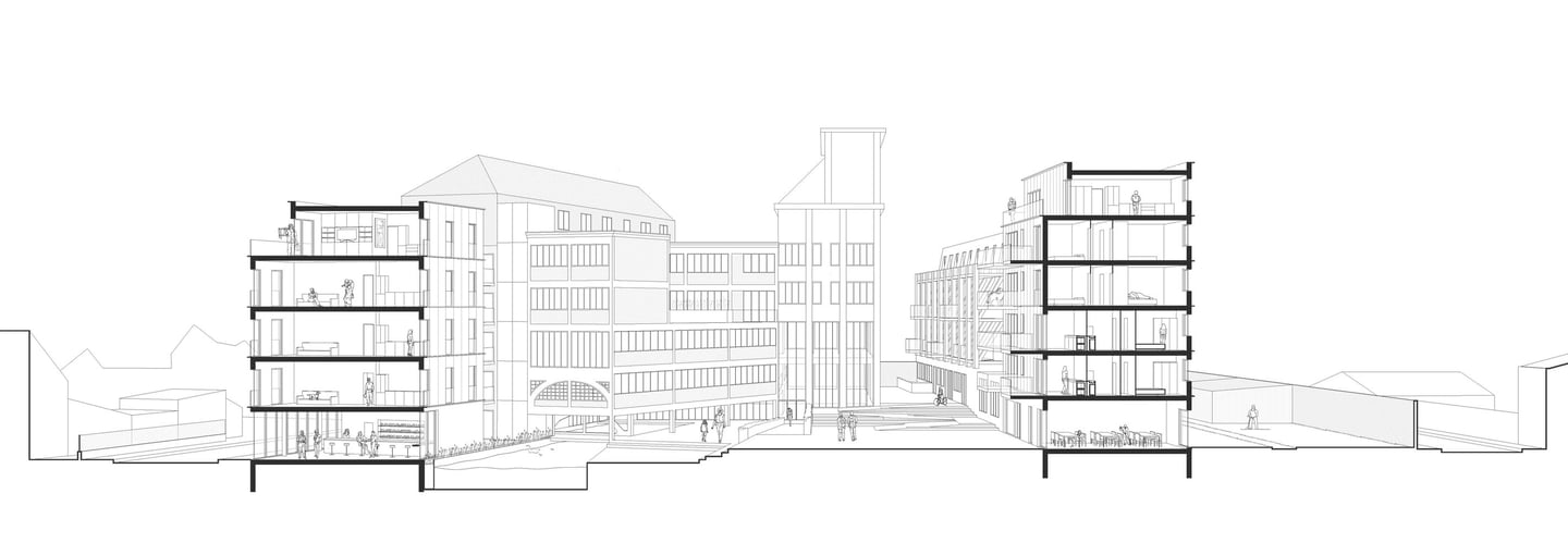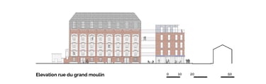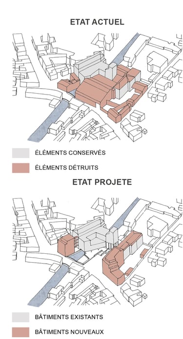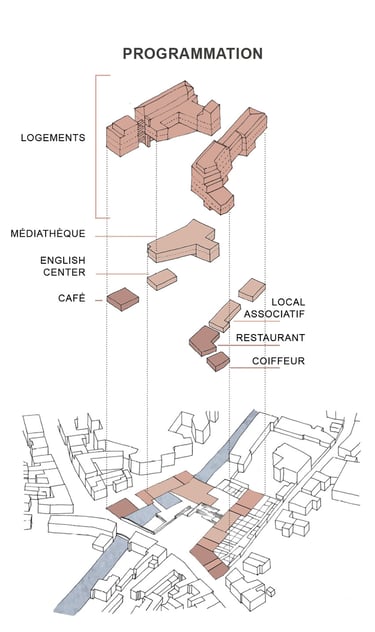 Programme : 27 logements collectifs réhabilités, 18 logements neufs, commerces, médiathèque