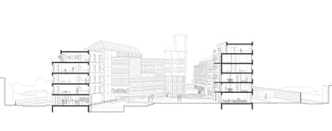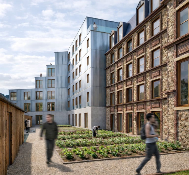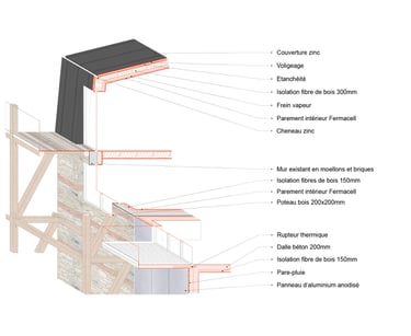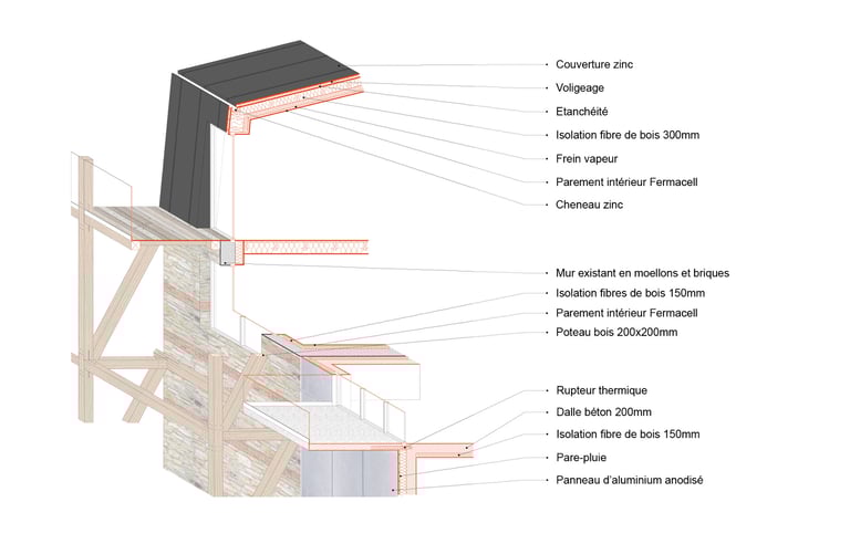 Matériaux : Béton bas carbone (planchers, façades), Bois (planchers, charpente, structure des balcons, isolation laine de bois), briques (façade), aluminium (bardage, menuiseries)