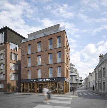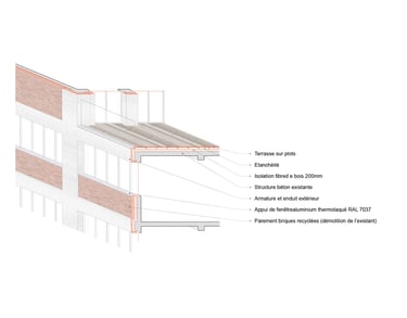 Matériaux : Béton bas carbone (planchers, façades), Bois (planchers, charpente, structure des balcons, isolation laine de bois), briques (façade), aluminium (bardage, menuiseries)