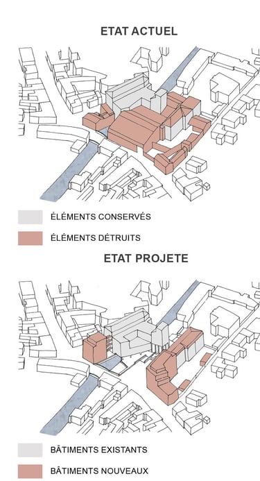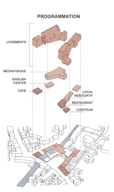 Programme : 27 logements collectifs réhabilités, 18 logements neufs, commerces, médiathèque